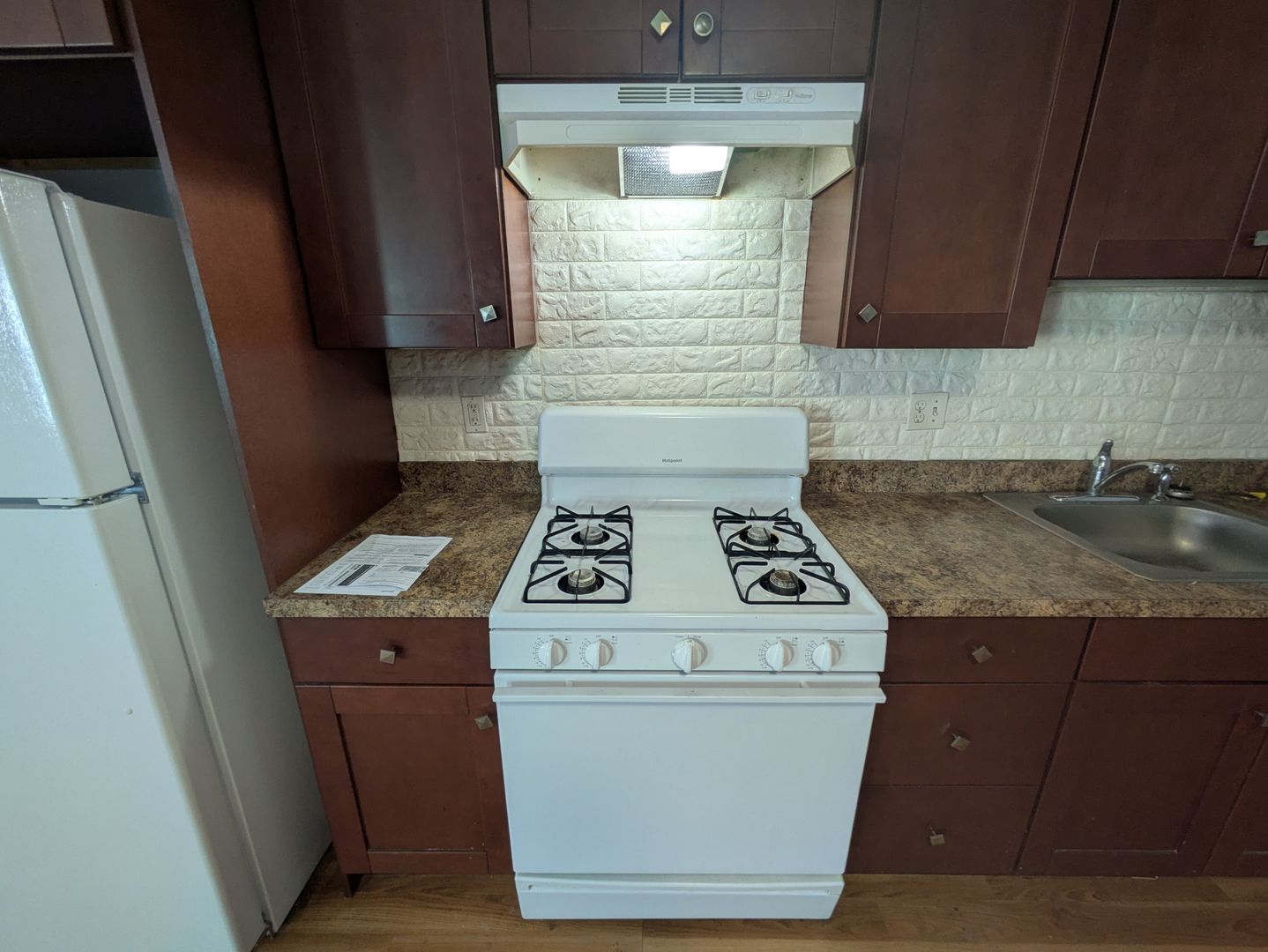 Modern Kitchen: Boasts newer cabinetry, a dedicated hood vent, a refrigerator, and a gas stove for the home chef.