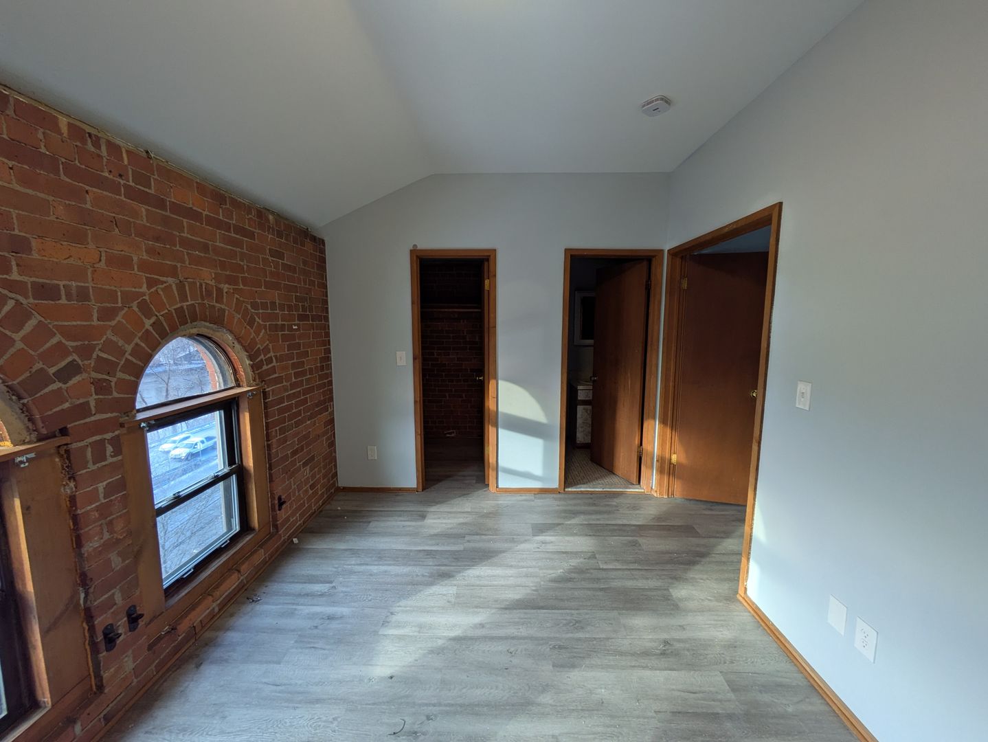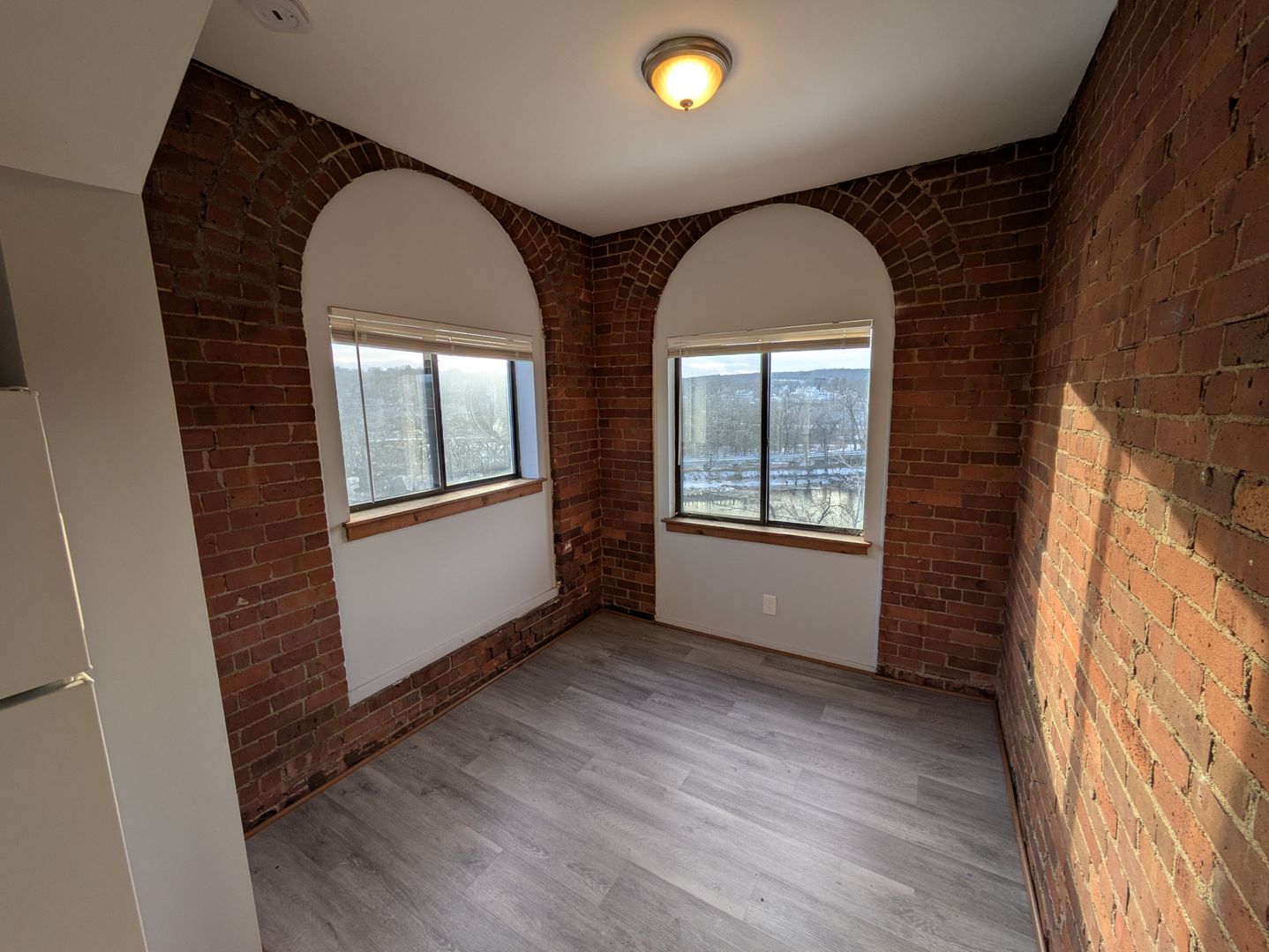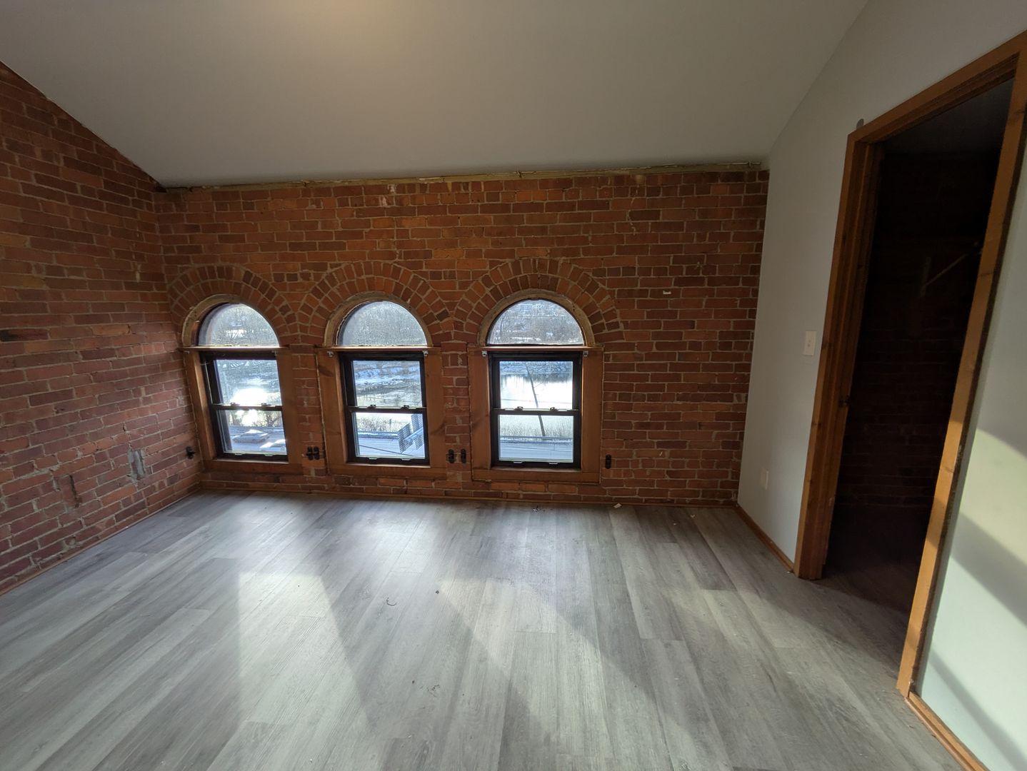 Historic Windows: Massive brick-arch windows that frame the water views.
