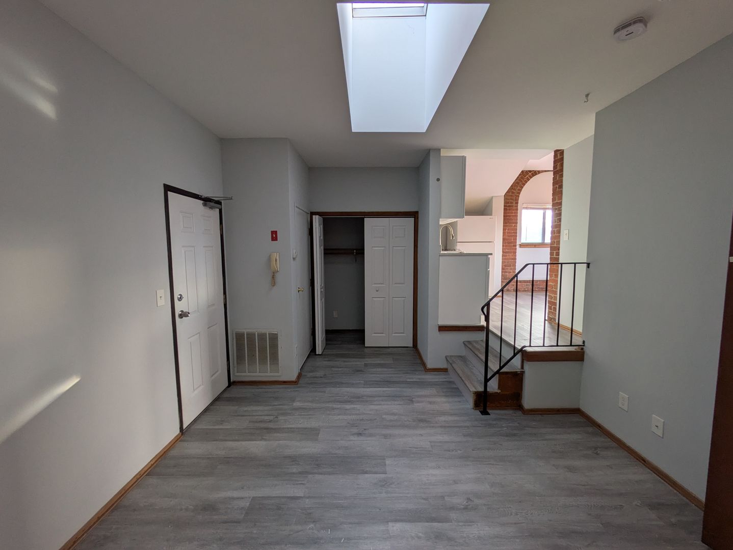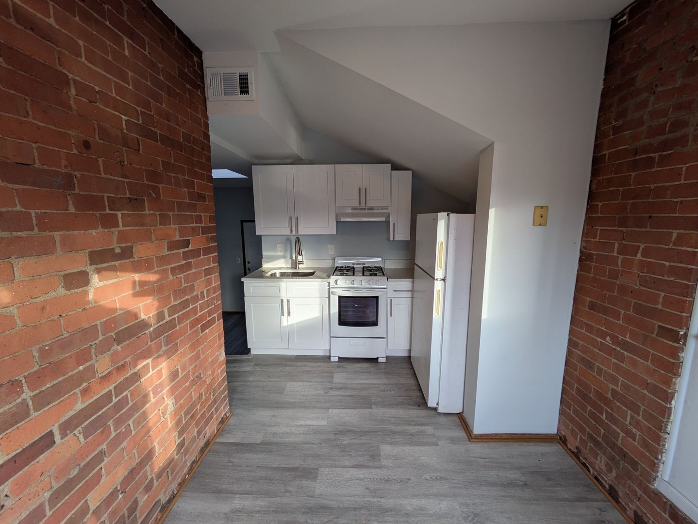 Step into an open-concept living area featuring soaring ceilings, original exposed beams, and authentic red brick walls. The interior has been thoughtfully updated with brand-new LVT flooring throughout, combining modern durability with timeless style.
